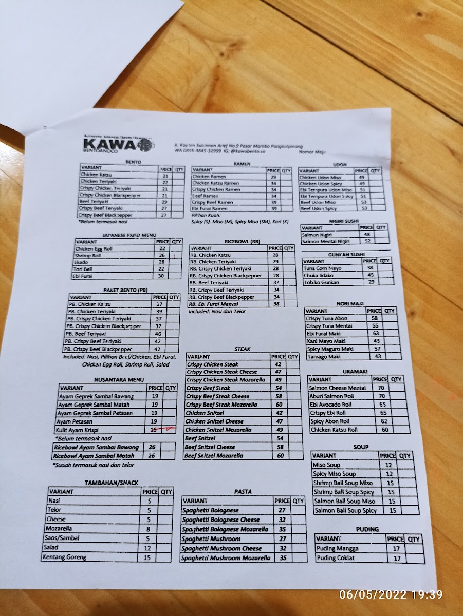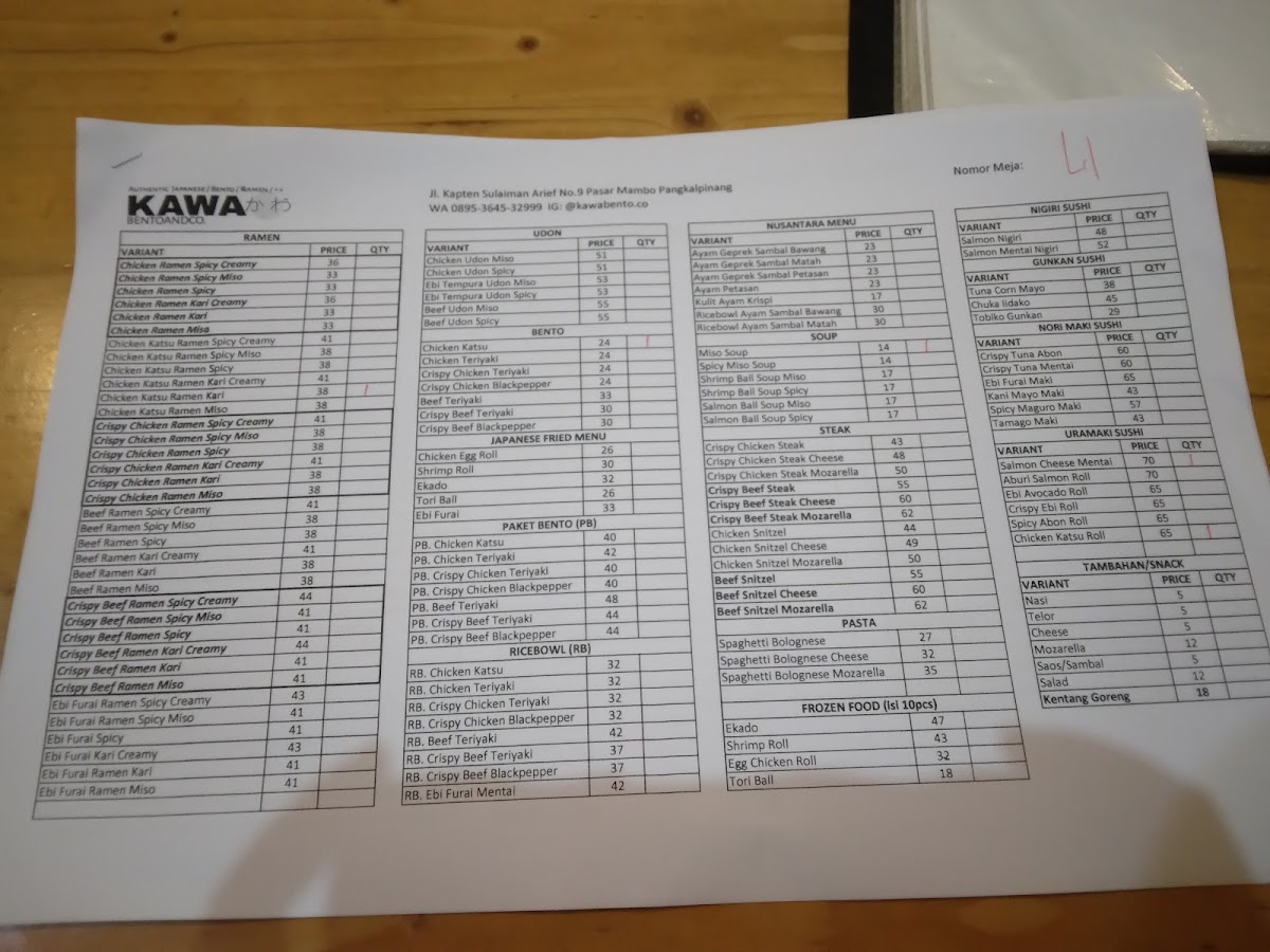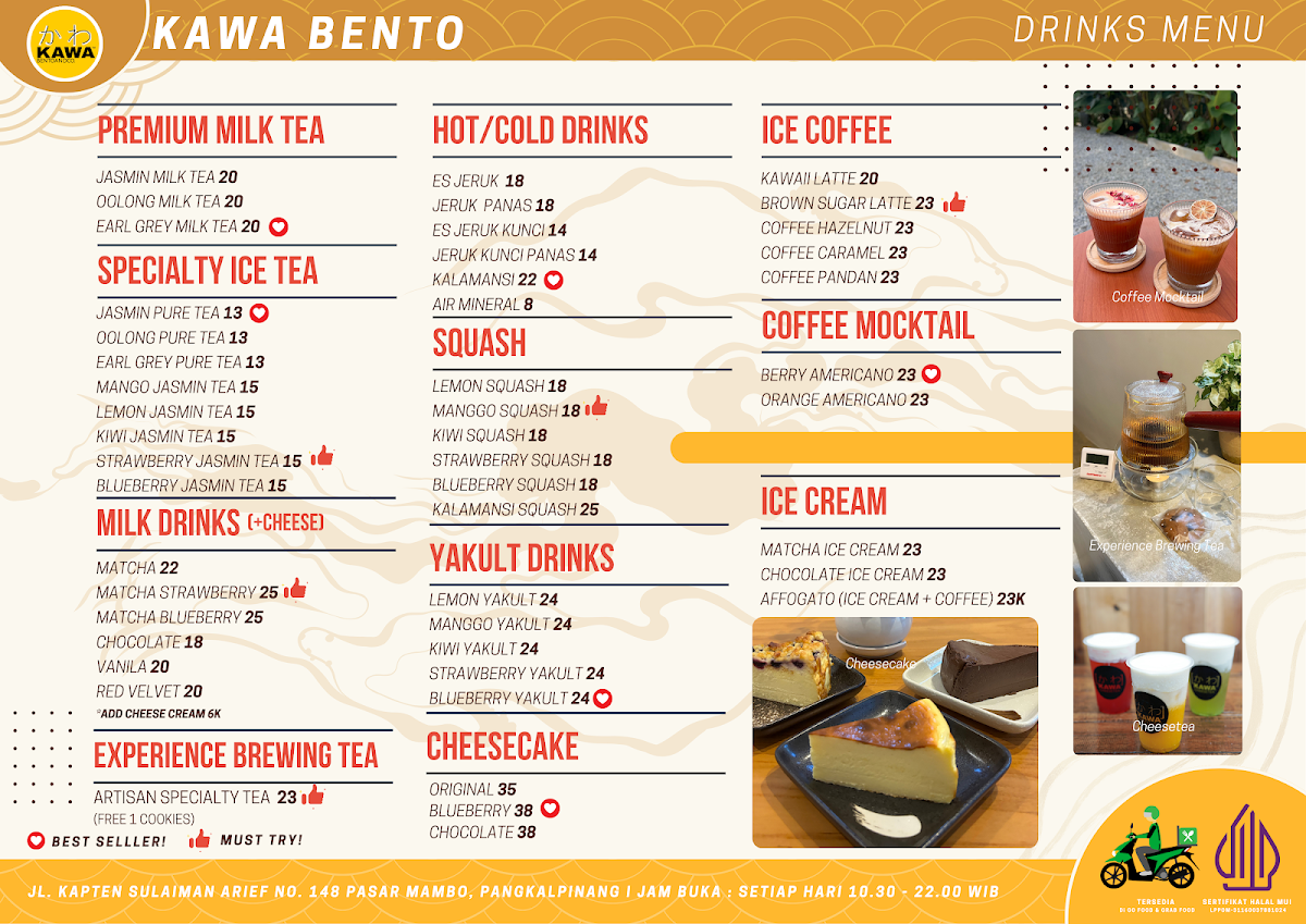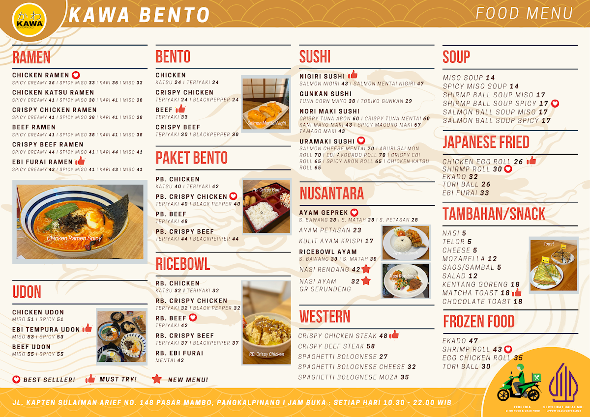 KAWA Bento & Co. offers a true taste of authentic Japanese cuisine in the heart of Pangkal Pinang. This Halal-certified eatery shines with its diverse menu, featuring expertly crafted ramen, fresh sushi, flavorful udon noodles, and beautifully presented bento boxes. Highlights include the Chicken Katsu Ramen Spicy and the Crispy Beef Ramen Spicy, both richly topped with egg, corn, seaweed, and fresh vegetables, delivering a perfect balance of spice and savor. The bento selections, such as the Beef Teriyaki Bento, showcase carefully layered flavors with attractive presentation that appeals to both the eyes and the palate.